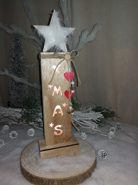 En bois naturel surmonté d’une étoile aux filaments tout doux, avec sa guirlande à leds intégrée diffuse une douce lumière. Moderne et cosy avec ses deux petits coeurs rouges, à poser sur un meuble ou sous le sapin.