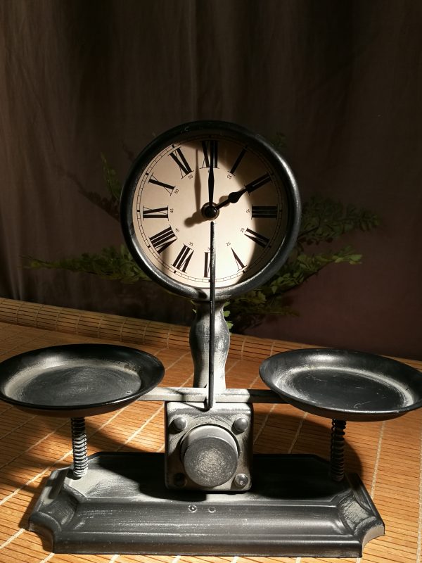 Horloge métal verre à poser balance vieilli noir dimensions 34 x 13 x 30.5 cm