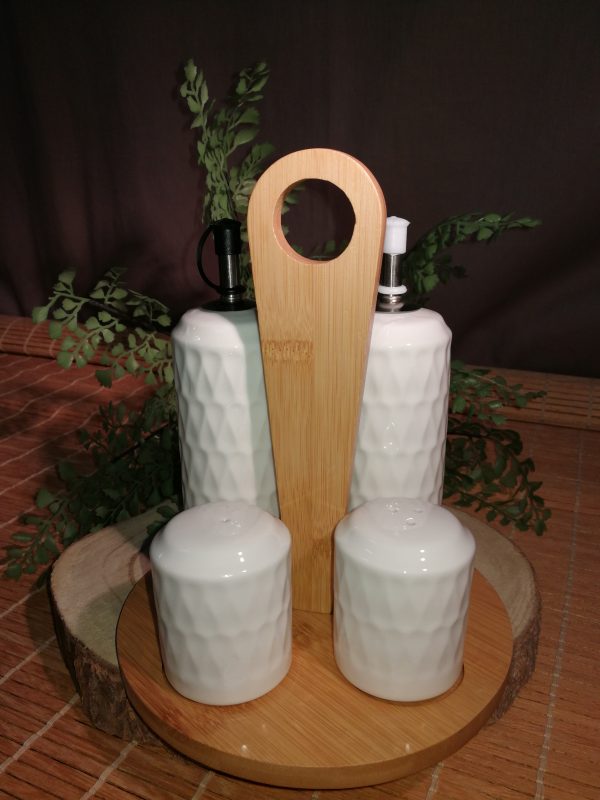 Huile vinaigre poivre sel 5 piéces porcelaine blanche bambou dimensions 17 x 17 x 20 cm