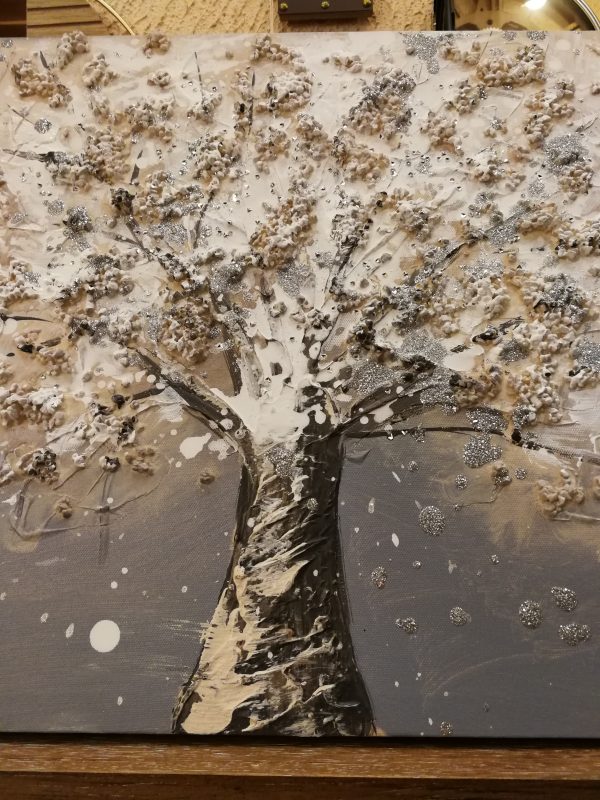 Magnifique tableau d’un arbre aux nuances de gris, blanc et argenté et avec des reliefs.